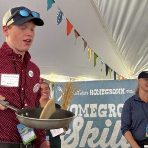 YODER: Well, I’d like to talk first about the way that HOMEGROWN is more than about a food service brand. HOMEGROWN Concessions® is trademarked uh as a food service brand, but it is nestled within a larger idea that food and the experiences of farmers can come together when all of us participate, you know, in our food experiences. We want to participate in everything that has to do with nurturing our bodies and feeding our families homegrown was an idea that came from a burgeoning interest in family farmer food, uh particularly at the beginning of the two thousands when the organic rule came in and there was enormous interest in local food. We’d already seen the beginnings of factory farm food. And I think people were beginning to have questions about how can we uh get back to knowing the source of our food. So we began to look into how can we bring more eaters to love family farmers and to seek out the source of their food.