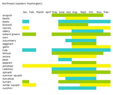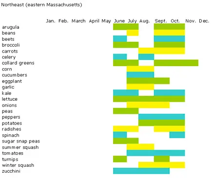 To be honest, I have to confess that my methodology was not scientific. In the interest of time, I picked one state that was hopefully representative of the region and tracked down a harvest calendar. Surprising, this info isn’t always easy to come by. My best luck was with CSA farm web sites where farmers often post schedules for their shareholders. Sometimes, farmers markets had calendars posted as well.