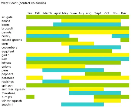 So, I set off on a quest to find regional harvest calendars, produce schedules and some more information about who can get what when. I divided the country into six regions: the Northeast, the Southeast, the Midwest, the Southwest, the Northwest and the West Coast. I chose a list of veggies (maybe I will tackle fruits next year) and tried to figure out the range of each region’s growing season.