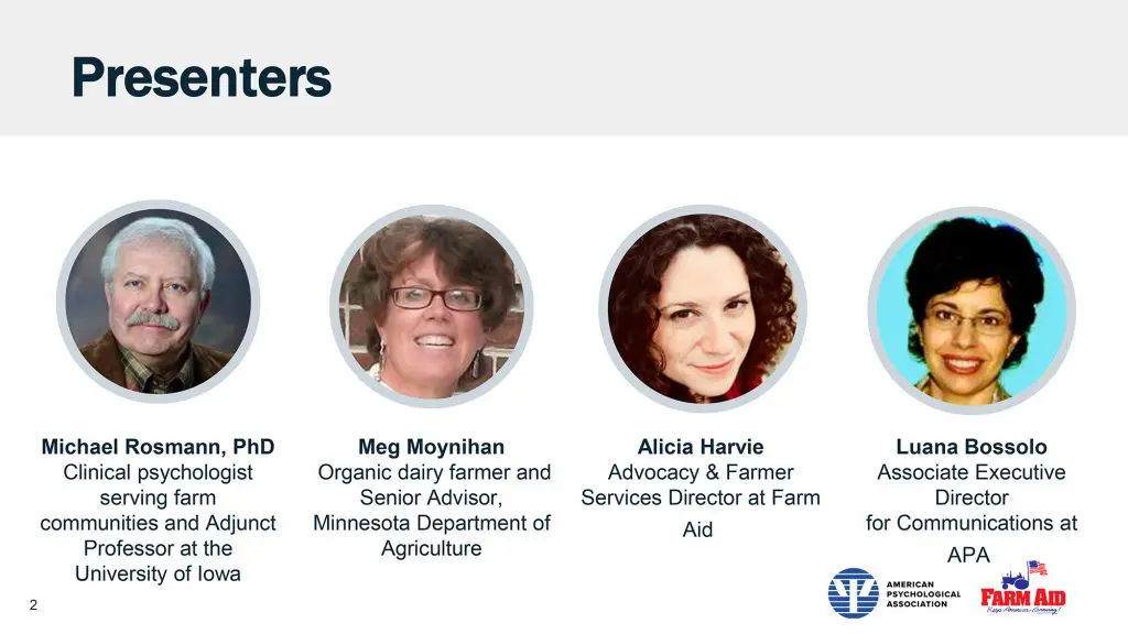 Webinar presenters included Farm Aid’s Alicia Harvie, director of farm advocacy and farmer services; Meg Moynihan, a Minnesota dairy farmer and a senior advisor at the MN Department of Agriculture; and Dr. Mike Rosmann, an APA member and psychologist who works with family farmers through AgriWellness, Inc., a nonprofit seven-state program he founded which promotes accessible behavioral health services for underserved and at-risk populations affected by the farm crisis and by the ongoing transitions in agriculture.