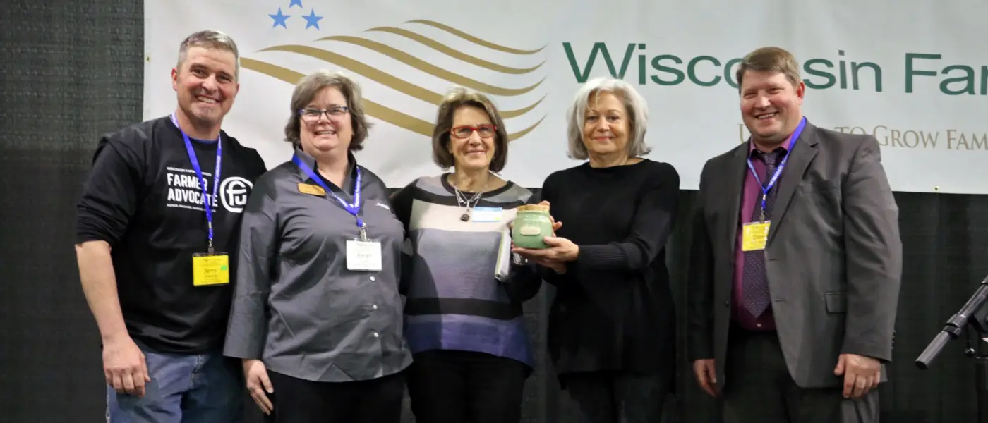Dairy farmers Jerry Volenec and Sarah Lloyd (left) and WFU President Darin Von Ruden (right) presented the Friend of the Family Farmer Award to Farm Aid for their work on behalf of family farmers. Farm Aid Executive Director Carolyn Mugar and Associate Director Glenda Yoder accepted the honor.