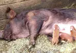Ed’s pigs are raised outside, where they can socialize and root in normal pig fashion. His 12 sows give birth in huts where they can build nests, creating a safe and welcoming environment for their piglets. They eat a high-fiber diet, a ration that Ed makes himself from the grains grown on his farm. As Ed explains, his pigs take longer to “finish” than the average factory farm pig – about 7 months opposed to a factory farm finishing time of about 4 1/2 to 5 months. But the success of Curly Tail Organic Farm is testimony to the fact that the work it takes to raise happy, healthy, organic pigs is worth it.