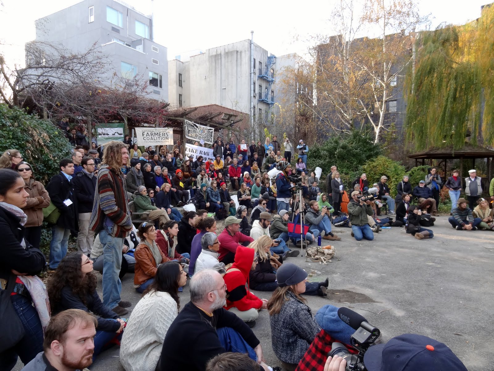 On Sunday, Farm Aid joined hundreds of fellow farm advocacy groups, food justice organizations, activists, eaters, and most importantly, family farmers, from across rural and urban America for the Occupy Wall Street Farmers’ March. In La Plaza Cultural Community Garden farmers and activists spoke out against the devastating effects that corporate control has had on the health of eaters, our natural resources, family farm agriculture and our economy before marching together to Zuccotti Park. The gathering brought awareness to the issues, but also celebrated the resilience and innovation of family farmers and fostered inspiration and a vision for a better future for agriculture free from corporate control.
