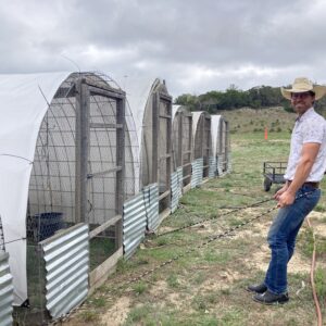 KURN: Yeah, that’s right. It was a pretty amazing place with hundreds of acres, mostly hilly, uncleared land, dotted with oaks, and there were Texas blue bonnets everywhere. When Tina and Orion first got to the ranch, they noticed that much of the soil was compacted and effectively dead. So they started in on their plan for soil restoration. This was a multi pronged approach that began when they sent in their chickens to do what they do: peck at the soil and create gorgeous fertilizer for the ground.