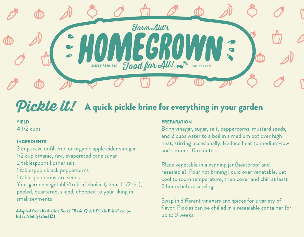 Farm Aid will be leading demonstrations of DIY seed packet origami, sharing seeds of seasonal crops that can be transformed into delicious pickles year-round, and providing a recipe for an easy, quick pickle brine that can be used on all the fruits and veggies in your garden. We hope you’ll join us in taking the Farm Aid Pickle Pledge!