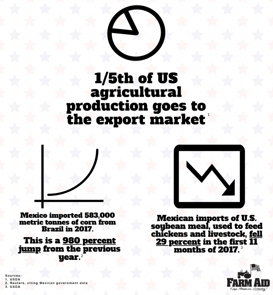 In the meantime, Trump’s strategy, or lack thereof, has put America’s farm exports at risk. That’s critical because 1/5th of U.S. agricultural production goes on the export market. American farmers are able to grow more food than the United States needs to feed ourselves, so we need export markets—if they go away, the farm economy will take an even deeper dive. At the Farm Bureau meeting and in his State of the Union, Trump made no reference to the turmoil his flip-flopping on trade has created for family farmers and the agricultural economy. The mixed messages have already damaged exports for family farmers, and the resulting glut of grains has dropped the price of corn and soy even lower. Our NAFTA trade partners, Canada and Mexico, have increased their trade globally with China, South America and Europe. They’ve formed new trade agreements that could damage the standing of U.S. farm imports in Canada and Mexico, and leave American farmers in the lurch.