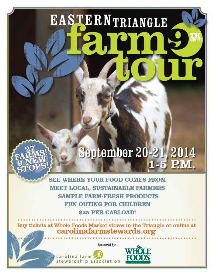 For those local to the area, Carolina Farm Stewardship Alliance has you covered the next weekend. Check out their 9th annual Eastern Triangle Farm Tour of 27 farms on Saturday and Sunday, September 20 and 21!