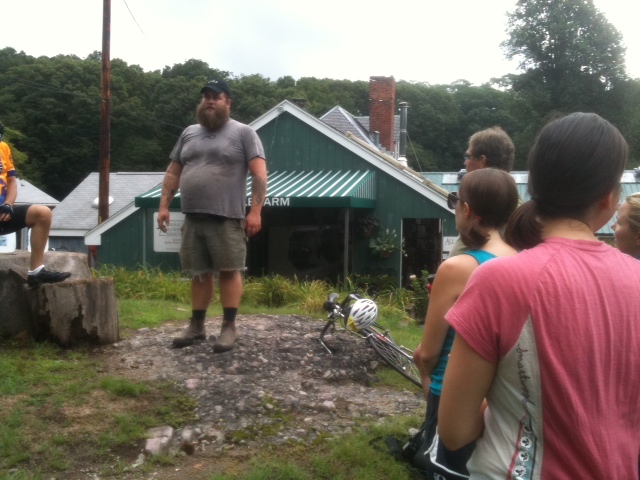 Our final farm stop was Brookwood Community Farm, where we were treated to lunch of heirloom tomato and cheese sandwiches. The founders of Brookwood petitioned the town of Milton to put farmland that was in conservation back into production. So far, Brookwood has been granted a lease to work four acres of the 160 in conservation, and just like the other farms on our ride, they use that land to best use, using organic methods to grow vegetables for their CSA members and local farmers markets. Brookwood has as part of its mission to produce and make good food accessible to low-income residents, and they helped found a farmers market in the Mattapan neighborhood of Boston, which we rode past on our way to our final stop.