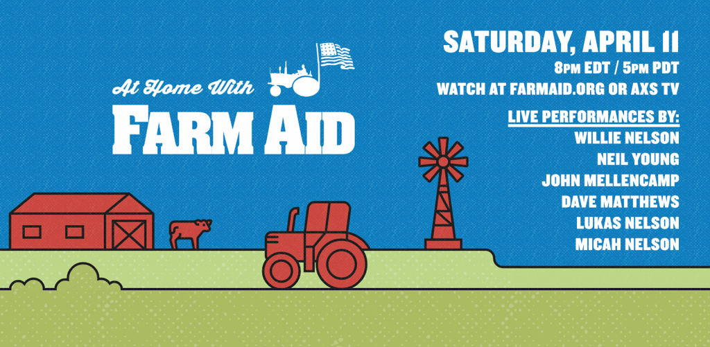 Join us on April 11 at 8pm EDT / 5pm PDT to watch live performances by Willie Nelson, Neil Young, John Mellencamp and Dave Matthews in a virtual show of support and solidarity for family farmers and ranchers. The event will be available as a free webcast stream on farmaid.org and axs.tv and also available to watch on AXS TV.