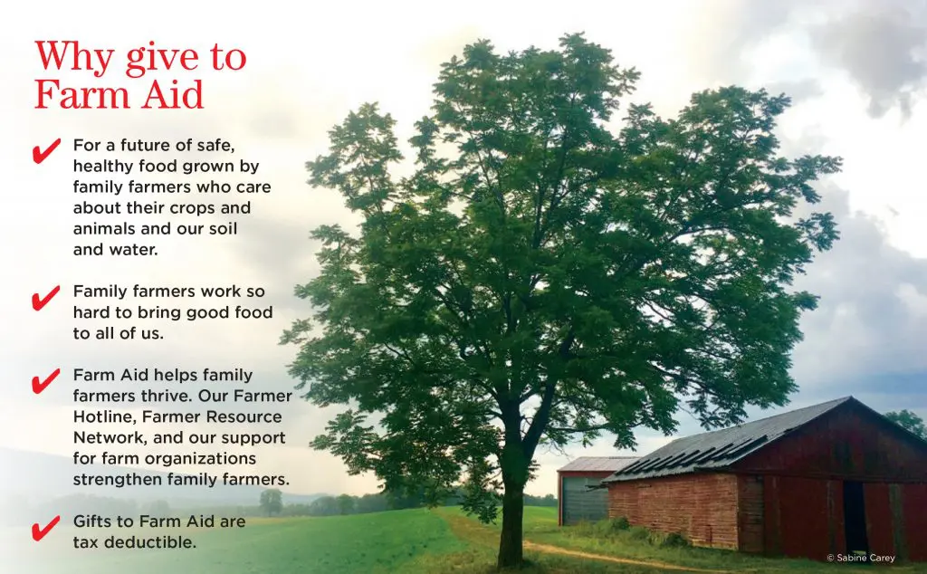 Please make a gift today to support Farm Aid and our nation’s family farmers. Your contribution will ensure their success and livelihood, so that we all have good food for healthy families, strong communities and protected soil and water.