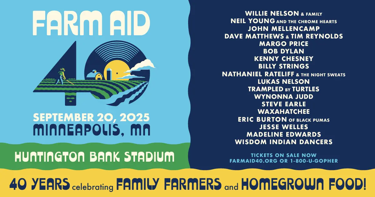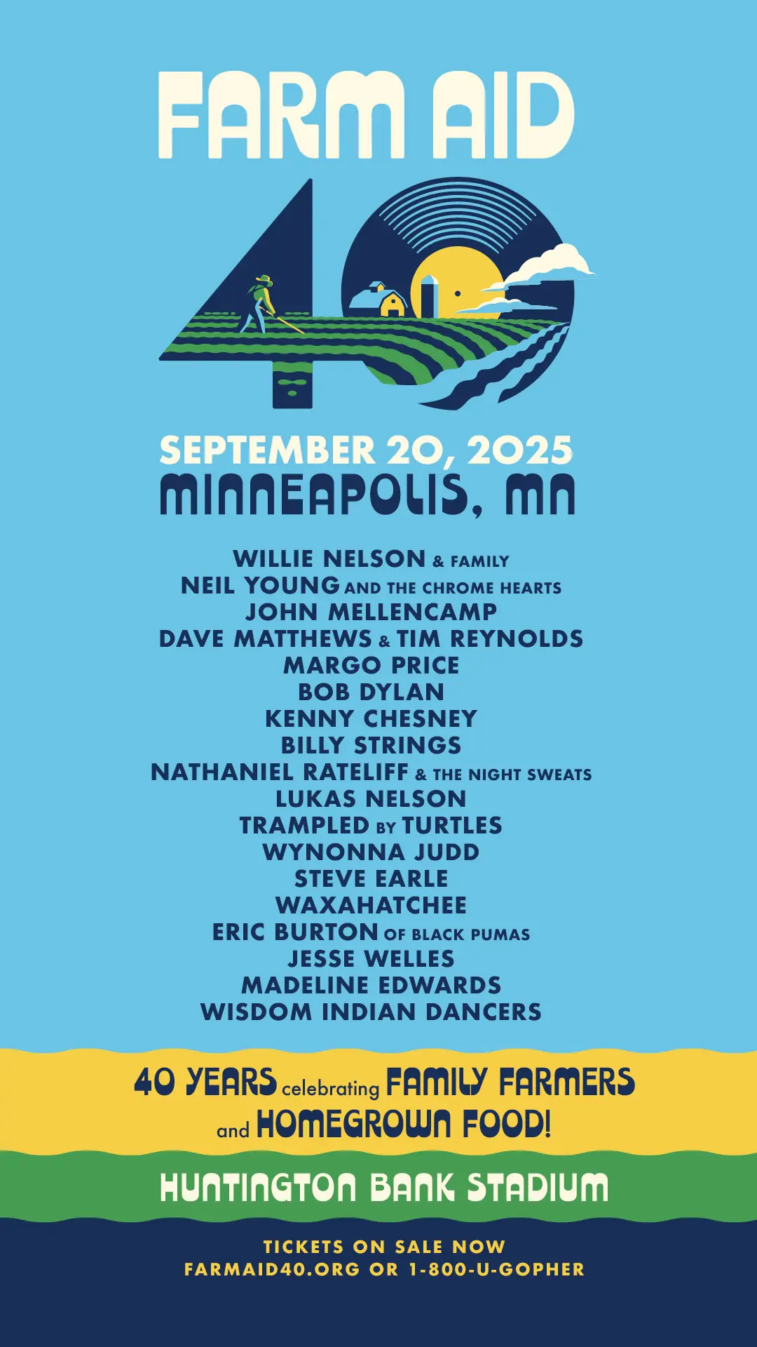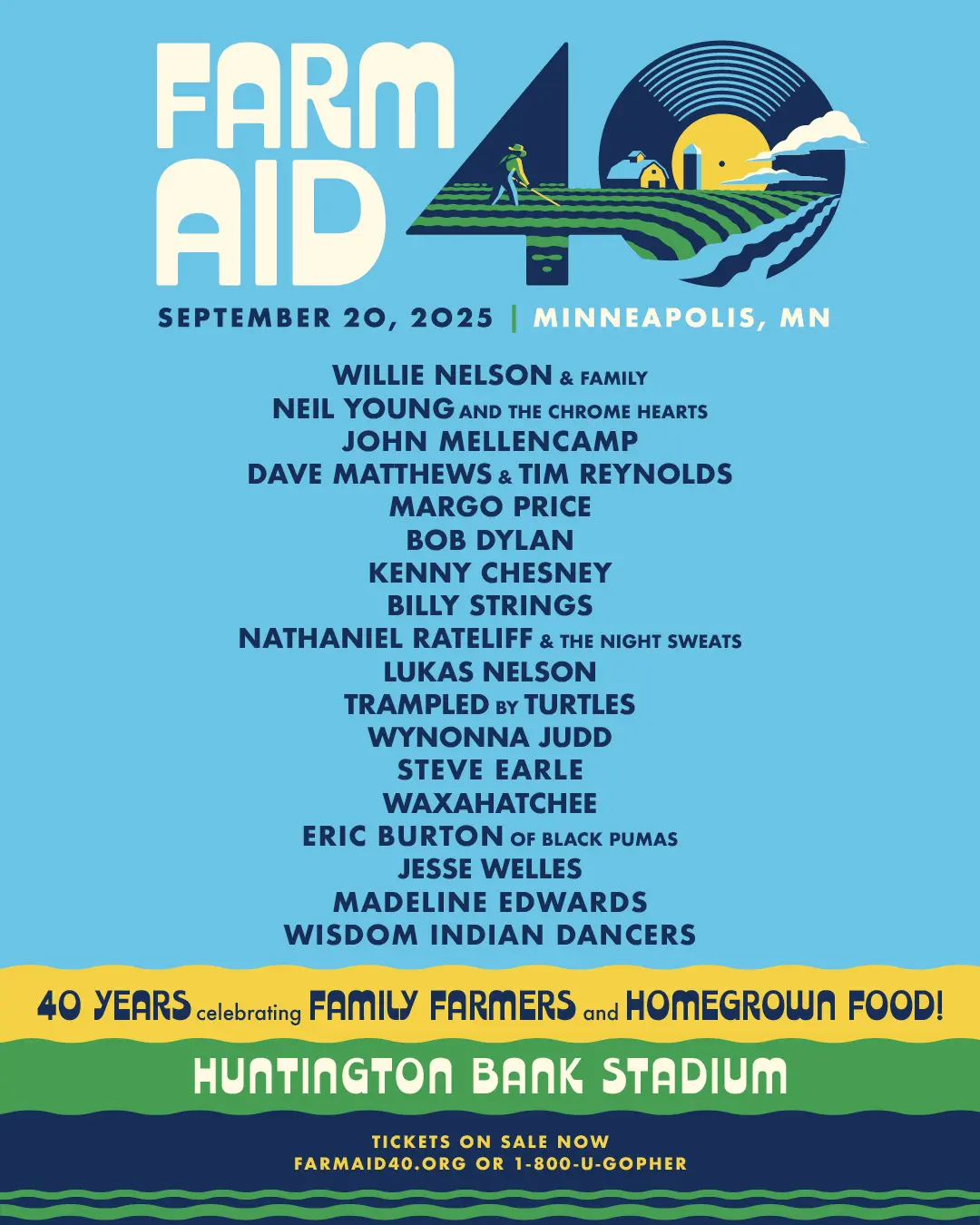 Farm Aid 40 will reunite family farmers and musician activists, with performances by Farm Aid board members Willie Nelson, Neil Young and the Chrome Hearts, John Mellencamp, Dave Matthews (with Tim Reynolds), Margo Price, as well as Bob Dylan, Kenny Chesney, Billy Strings, Nathaniel Rateliff & The Night Sweats, Lukas Nelson, Trampled by Turtles, Wynonna Judd, Steve Earle, Waxahatchee, Eric Burton of Black Pumas, Jesse Welles, Madeline Edwards, and Wisdom Indian Dancers.