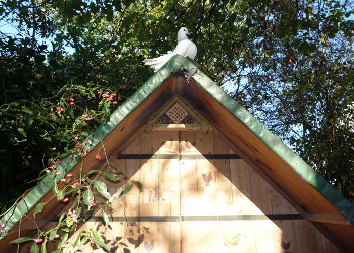 The only real cost for this hen house, apart from a few nails, screws, and 4 metal hinges, is the price of the roof covering: a heavy duty tarpaulin, costing around 25 Euros ($35). This is necessary if, like us, you are living in an area where you can get heavy snow and rain. Other materials involved are the wood finishes, in our case hemp and linseed oil. We also used natural earth and mineral pigments and découpage.