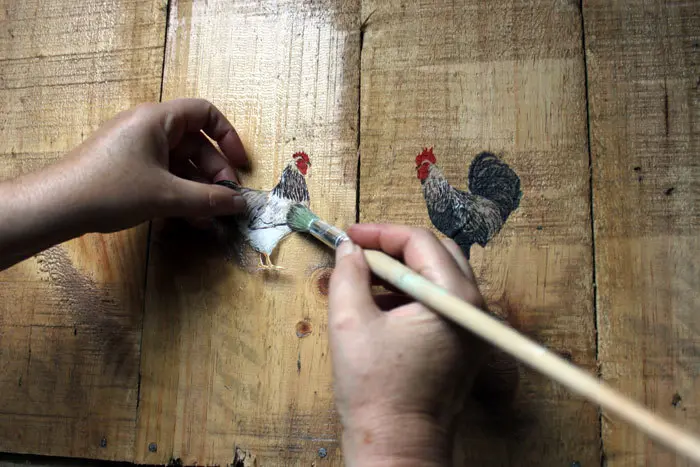 The front gable panel is decorated with découpage cut from paper napkins and is applied using a water-based acrylic varnish. In the hen house shown below and at the start of this piece, I cut letters from wrapping paper to complete my design and also used earth and mineral colours to create borders. I always use this same varnish to finish off the panel, rather than oil, which could damage the paper.
