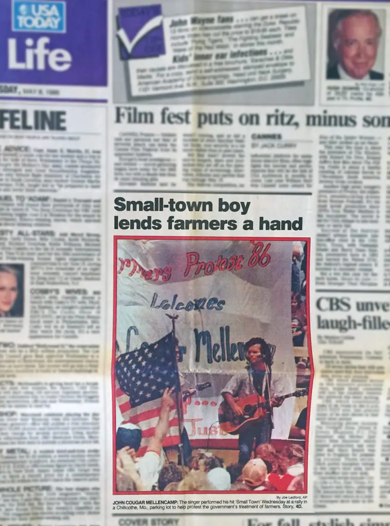 The farm crisis didn’t end in 1985, and Farm Aid’s actions for family farmers didn’t stop then either. We recently came across this May 8, 1986, copy of USA Today reporting on a rally in Missouri where John Mellencamp performed and spoke with farmers to protest the government’s response to the farm crisis.
