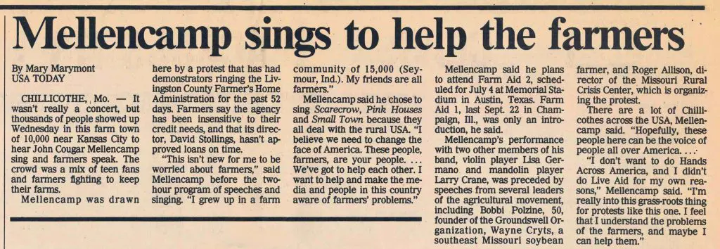 “I don’t want to do Hands Across America, and I didn’t do Live Aid for my own reasons,” Mellencamp said. “I’m really into this grass-roots thing for protests like this one. I feel that I understand the problems of the farmers, and maybe I can help them.”