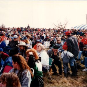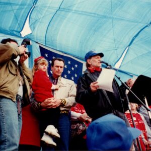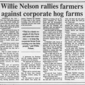 Here is where Farm Aid got involved. Working with Roger Allison, Rhonda Perry and others at the Missouri Rural Crisis Center – a local family farm organization and one of Farm Aid’s closest partner organizations, also founded in 1985 – Farm Aid program director Harry Smith organized a rally for April 1, 1995. After receiving more than twenty letters from residents of Lincoln Township, describing their struggle, Farm Aid president Willie Nelson pledged to come to the rally himself. “The residents of small towns deserve respect, and family farmers should not be forced from their land” by an enormous, encroaching factory farm, Willie said in a statement. “Farm Aid will continue to stand with farmers and rural residents whenever their future is threatened.” When Premium Standard Farms learned of the rally and of Willie’s involvement, the company dropped the monetary damages portion of its lawsuit against Lincoln Township.