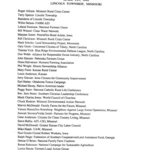 The farmers and rural citizens in Lincoln Township who stood up to Premium Standard Farms and launched a national movement against factory farms were not career activists or organizers. They were regular people who mobilized, like anyone would, when faced with a giant corporation, aided and abetted by craven public officials, putting corporate profits ahead of the health and well-being of communities. The Lincoln Township episode was just the start of the family farm fight against the industrial, corporate takeover of the U.S. livestock industry, and the people sent a clear message to the industry that they were in for a fight. Over the years, CFFE has stopped thousands of other factory farms from being built, and Farm Aid has been proud to support that campaign.